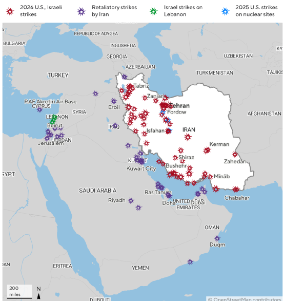 ▲美以联军空袭伊朗和伊朗反击局势图。